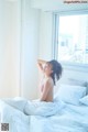 A woman in a bikini posing in front of a window.